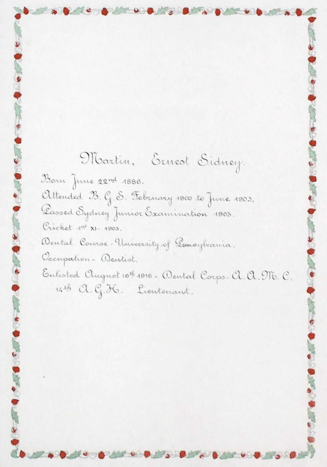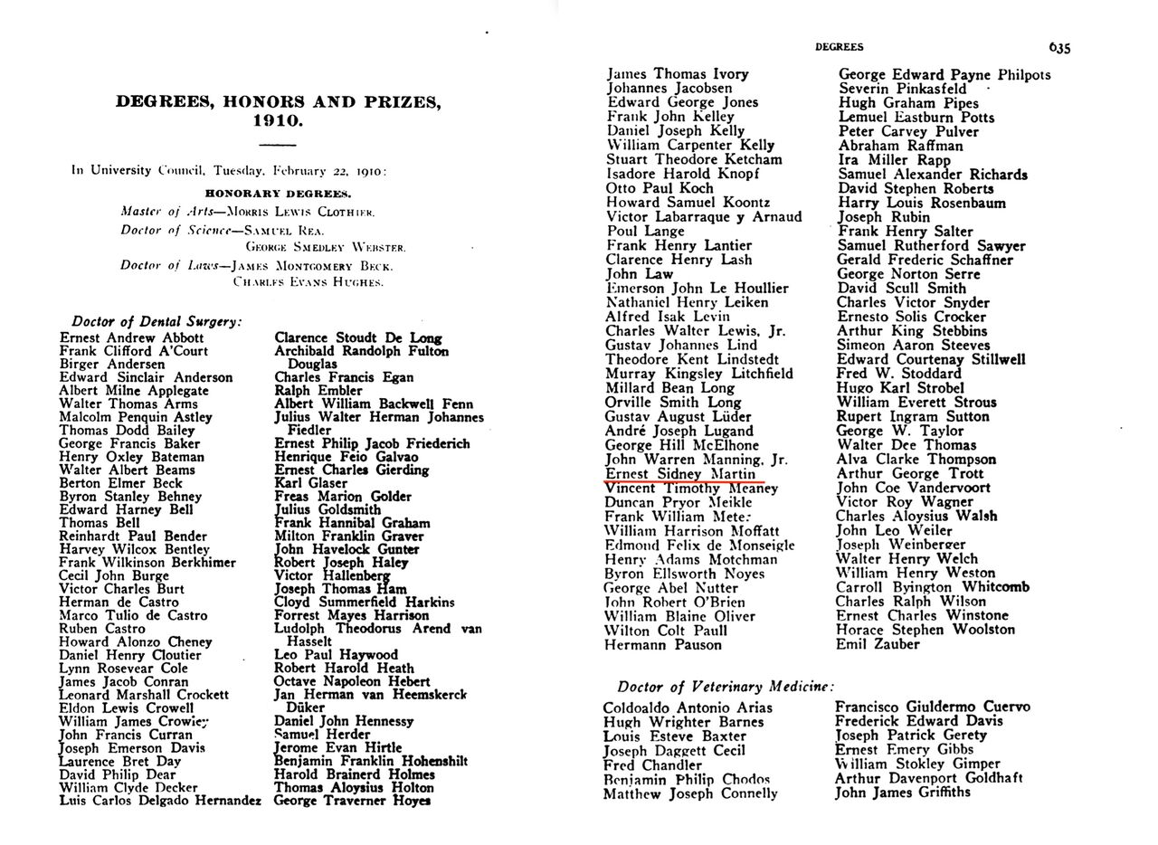 Ernest Sidney Martin is next recorded in the First Year Class of the Dental Student List in the Catalogue of the University of Pennsylvania 1907/0816. The University of Pennsylvania School of Dental Medicine, also known as Penn Dental Medicine, is among the oldest university-affiliated dental schools in the United States, with its origins dating back to 1852. Notably, the first Doctor of Dental Surgery (DDS) degrees were awarded in 1879.