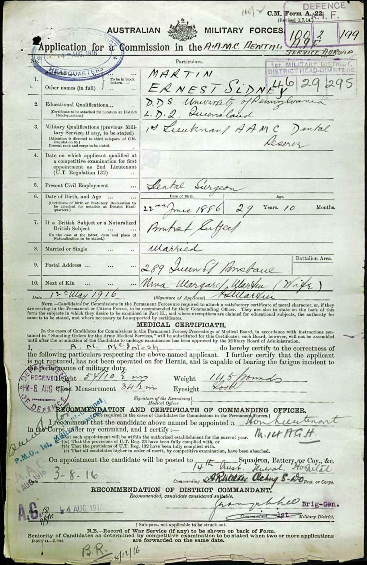 Ernest and Nina Martin were living at Hockings Street, Eagle Junction when Ernest enlisted in the Australian Imperial Forces (AIF) on 3rd August 1916 as an Honorary Lieutenant as part of the 71st Dental Unit attached to the No. 14 Australian General Hospital, AIF. His Attestation Papers gave his birth in Melbourne, Victoria and at the time of enlistment he was 30 years and 2 months with his Religious Denomination as Presbyterian.