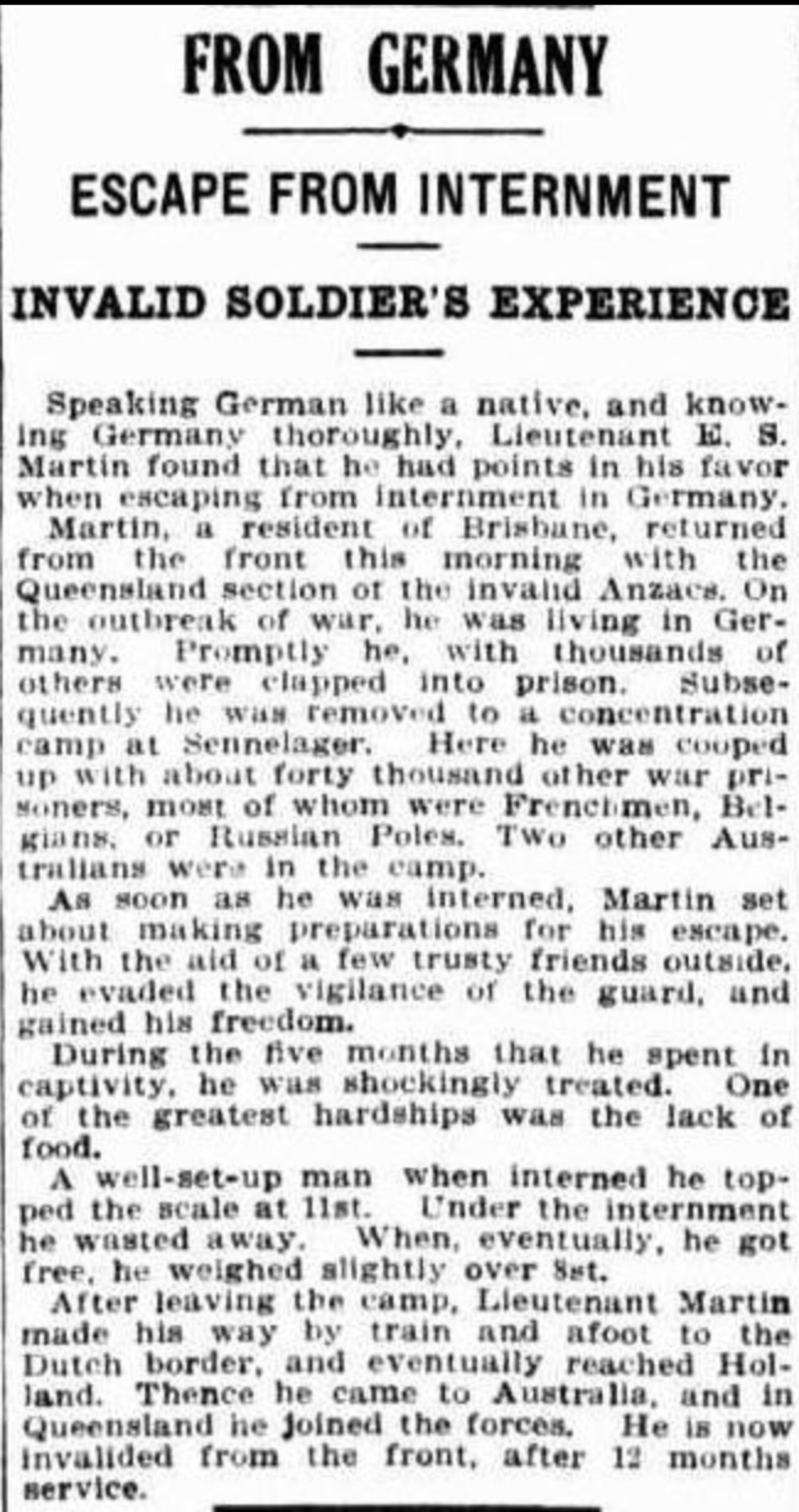 “He was practicing in Cologne at the outbreak of hostilities and was heartlessly taken from his wife and child and placed in a prisoners’ camp where he endured great hardships. Later he was arrested and accused of spying. He served eleven days in solitary confinement, the last eight of which he was in a state of delirium. Eventually he made good his escape and reached the sunny shores of Queensland again.”
