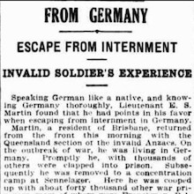 After his return to Australia, Dr E. S. Martin is recorded telling his story as a German POW in some detail at a Meeting of the Odonatological Society in 1916 held in the rooms of the Dental Hospital in Elizabeth Street, Brisbane. Ernest’s story was recorded in short in the Minutes24 viz: