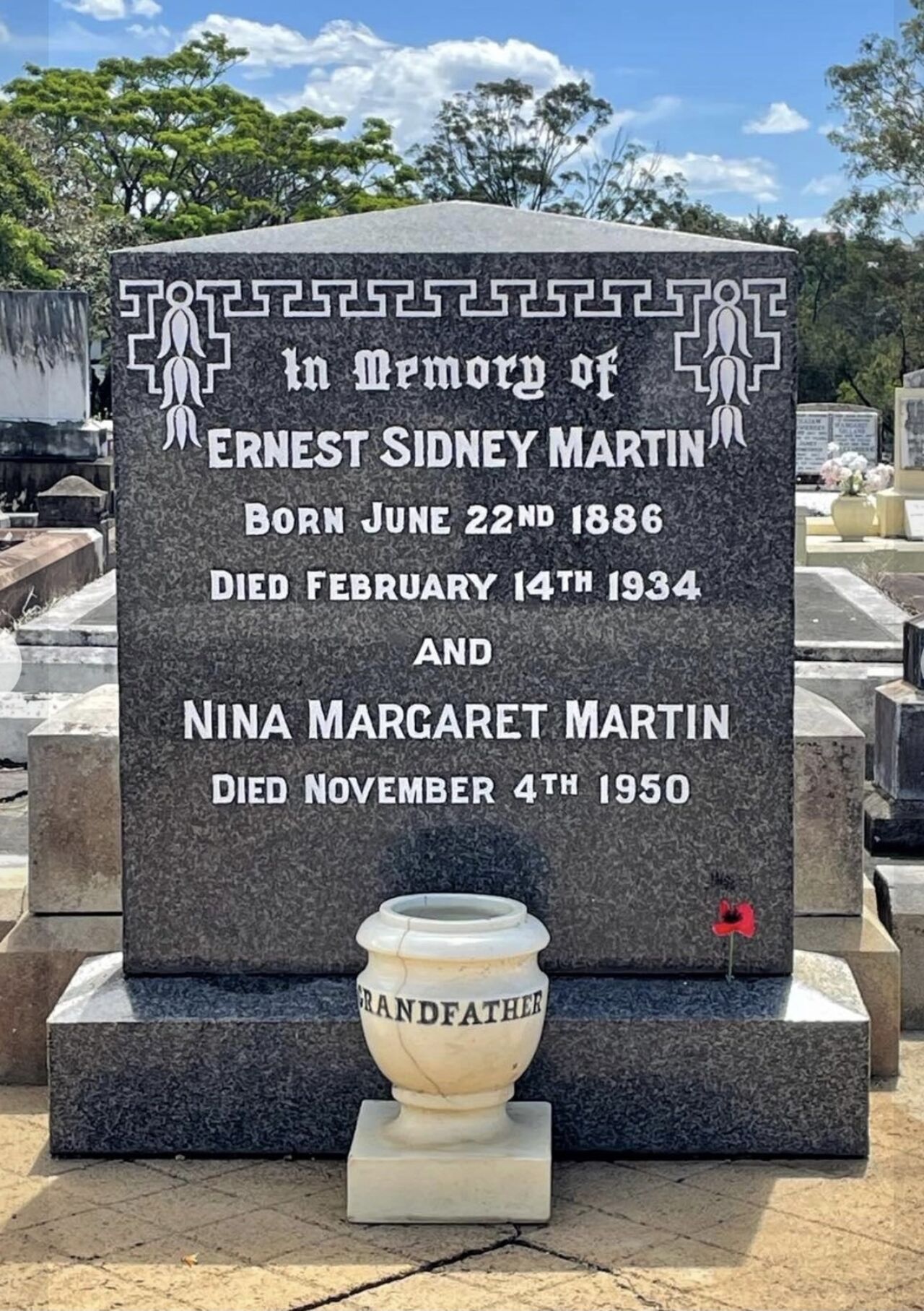 Ernest was survived by his widow, Nina Margaret Martin and three sons Brian Reid Martin, Merrill Reid Martin and Leonard Reid Martin. His funeral was conducted at the Lutwyche Cemetery on 15 February 193435.