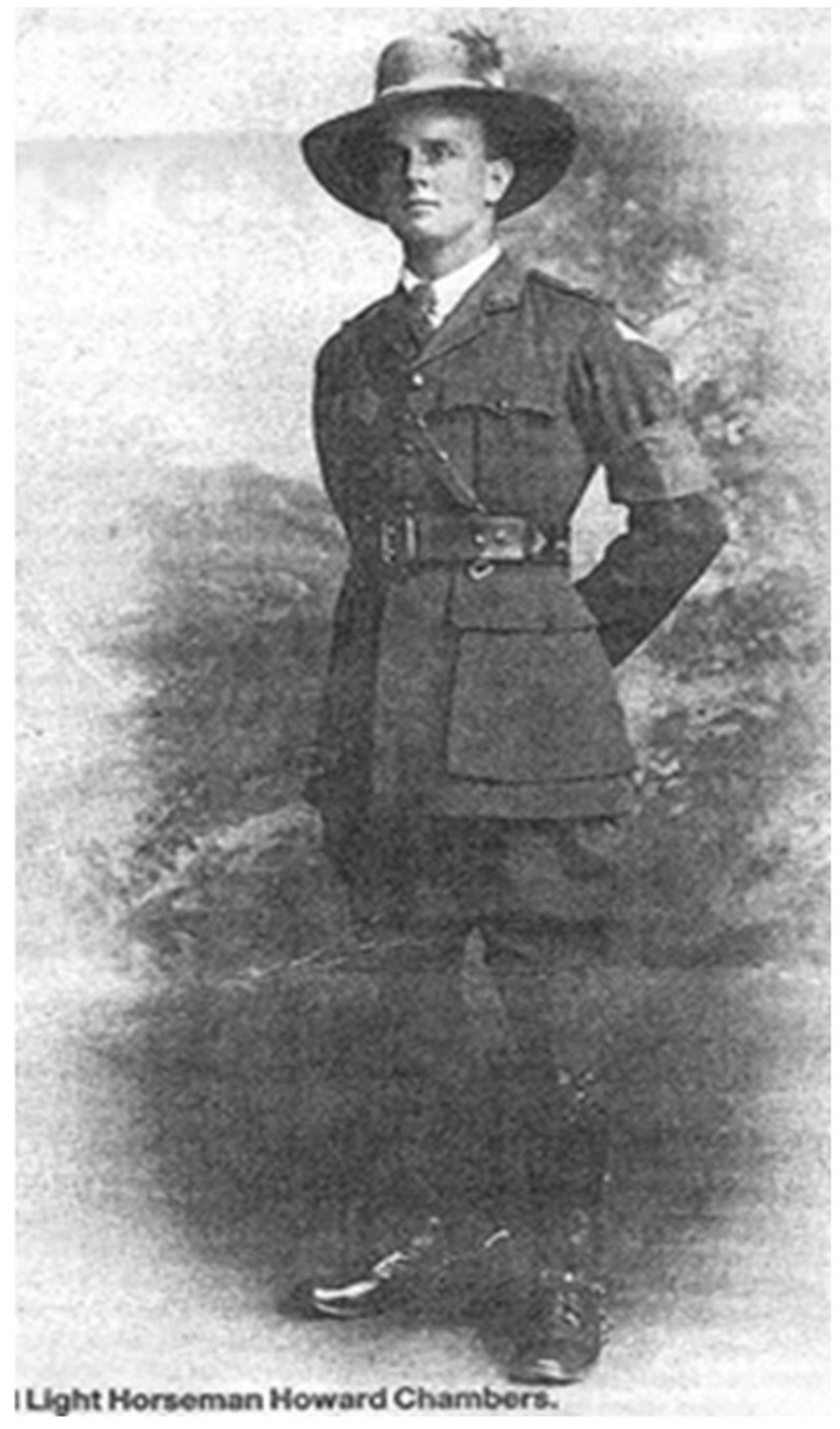 Howard Oliver Chambers was born in Nhill, Victoria in 1885, second son of Oliver Cromwell and Ellen Chambers.  The names of four Chambers soldiers - Arthur Frank Chambers, Howard, Leslie Norman Alec Chambers and Stuart Chambers - appear on one of the Honour Boards at Saint Andrew’s Uniting Church. They belonged to a large family of six brothers and four sisters. Their parents were Oliver Cromwell Chambers and Ellen (née Bosher). Mr and Mrs Chambers began their married life in 1877 at Nhill, Victoria where the older children were born. They later moved to North Queensland then Roma in Western Queensland. At the time when the four sons were enlisting for service in the Australian Imperial Force in the Great War, their parents were living on a farm called Balmah at Elbow Valley between Killarney and Warwick.